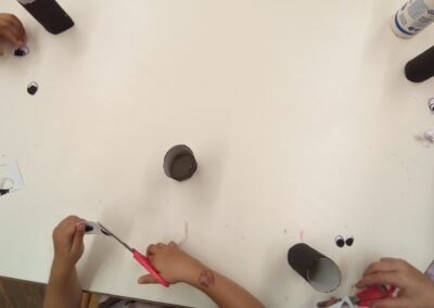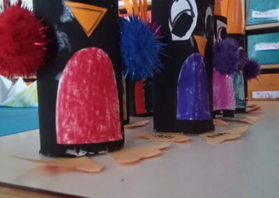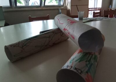 Oggi abbiamo usato materiali da riciclo: abbiamo fatto dei bellissimi pinguini con i rotoli di carta igienica a più fasi, abbiamo dovuto attendere che la tempera si asciugasse per poter passare al collage ma abbiamo avuto pazienza e il risultato è stato fantastico. Altri hanno usato i rotoli per creare delle maracas colorate usando i sassolini del giardino.