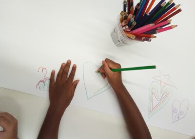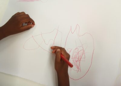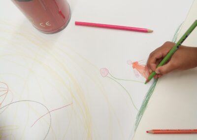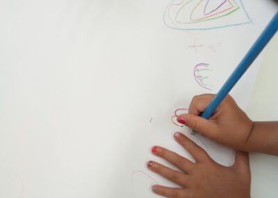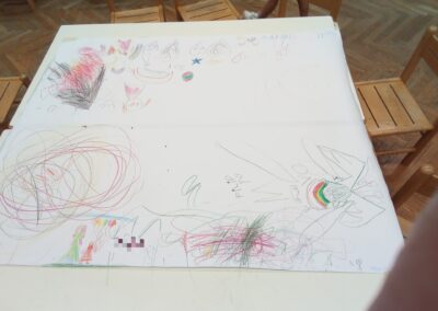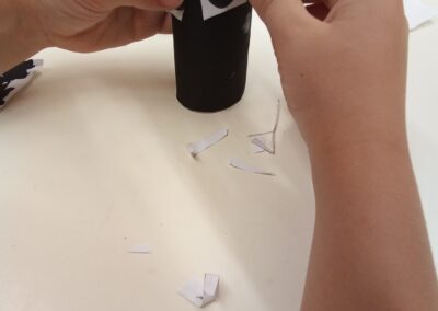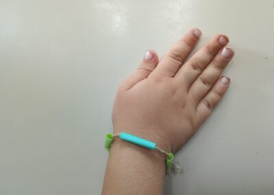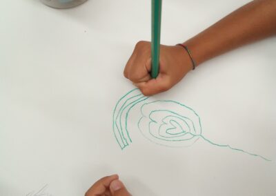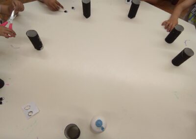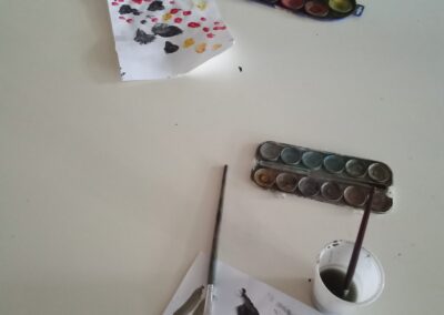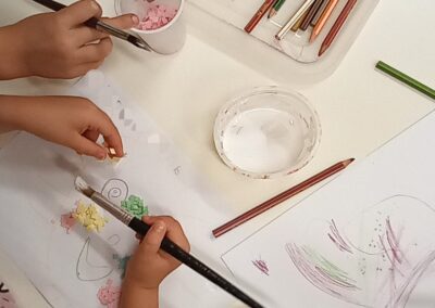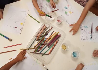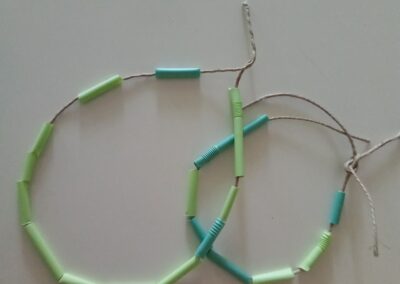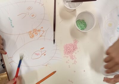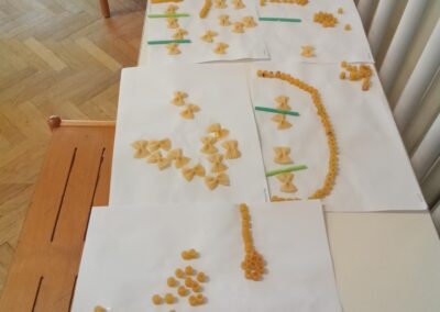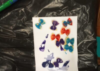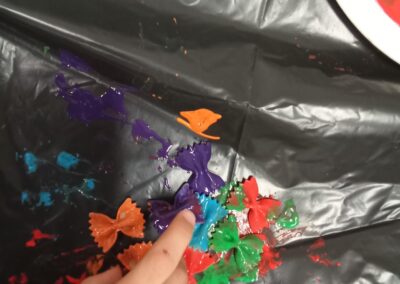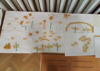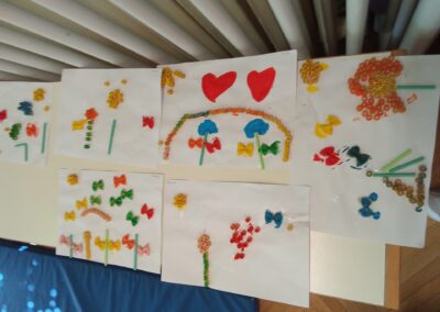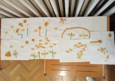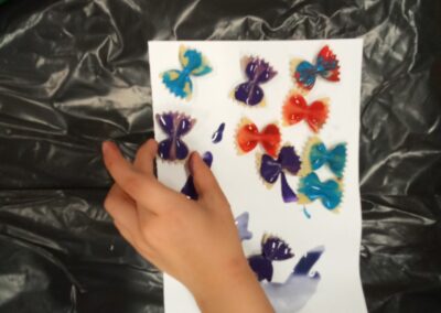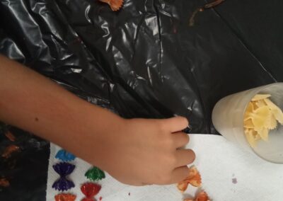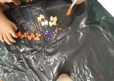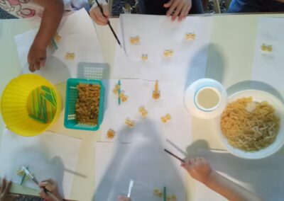 Abbiamo anche usato le cannucce per fare braccialetti e collanine. Un gruppo ha fatto collage a mosaico con i quadratini e pezzetti di carta colorata da attaccare sui disegni e altri ancora hanno poi fatto le farfalle di pasta, colorate e usate come spunto per dei disegni.