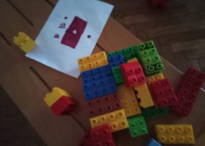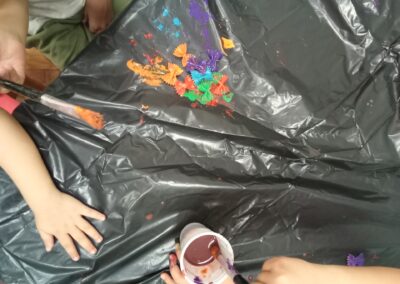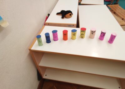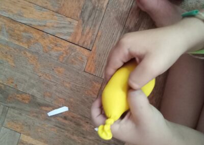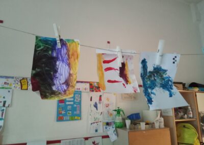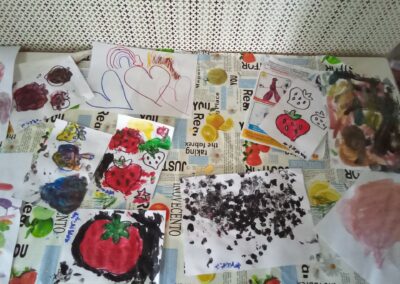 Dato il brutto tempo ci siamo dedicati ai laboratori, finché non è stato possibile uscire in giardino. Abbiamo fatto disegni usando la pasta e colorandola con le tempere e attività sensoriali a indovinelli con i pennarelli profumati e palloncini pieni di farina, sale, olio, sassi, pasta e simili per stimolare un po’ la curiosità dei bimbi. Altri hanno usato le tempere per colorare disegni di pomodori, fragole e altre cose buone mentre altri hanno usato gli acquerelli.