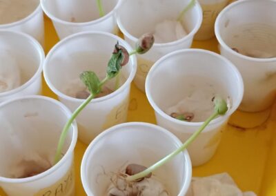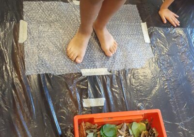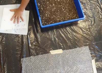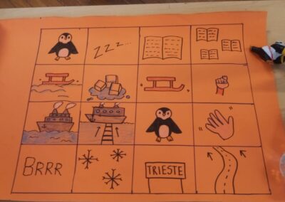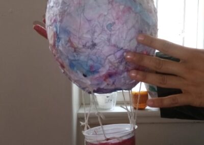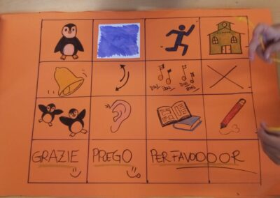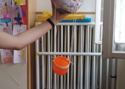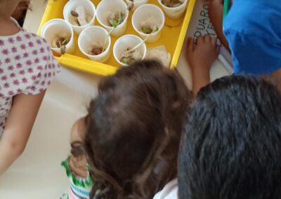 Ieri i viola ed i blu hanno avuto il primo raccolto del laboratorio botanico della settimana scorsa. I rossi preparano la canzone del pinguino viola, per la festa finale. Oggi gli arancioni hanno fatto un percorso sensoriale, mentre altri bambini sognavano di salire con le mongolfiere.