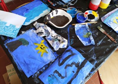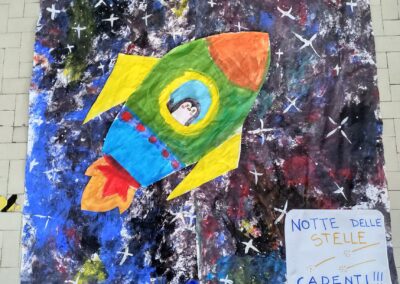 Poi pensiamo di usare anche i colori… che bei dipinti ne escono fuori! E per finire un lavoro collettivo con i colori rimasti nelle ciottoline… una notte stellata e il nostro Pinguino Marco che se ne va con l’astronave a spasso nello spazio!