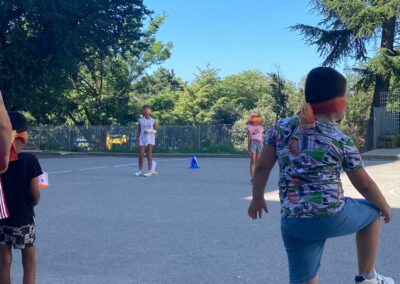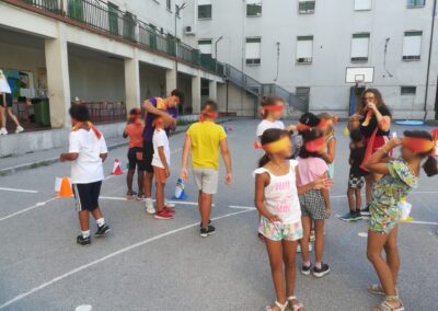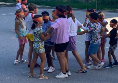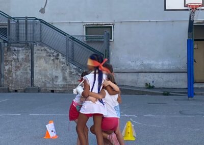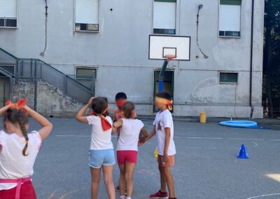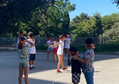 Questa mattina giochiamo agli ”Animali bendati”: 4 gruppi di bambini, ogni gruppo sceglie un animale e ne fa il verso. I maestri sparpagliano i bambini bendati che devono cercare di riunirsi al proprio gruppo trovandosi muggendo, miagolando, abbaiando o cinguettando…